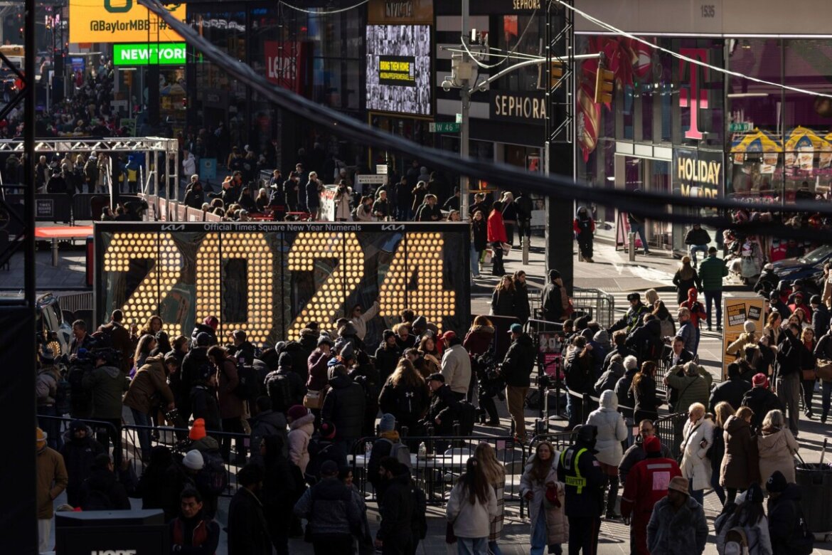**This image is for use with this specific article only** People gather December 20 around the 2024 New Year’s Eve numerals displayed in Times Square in New York.