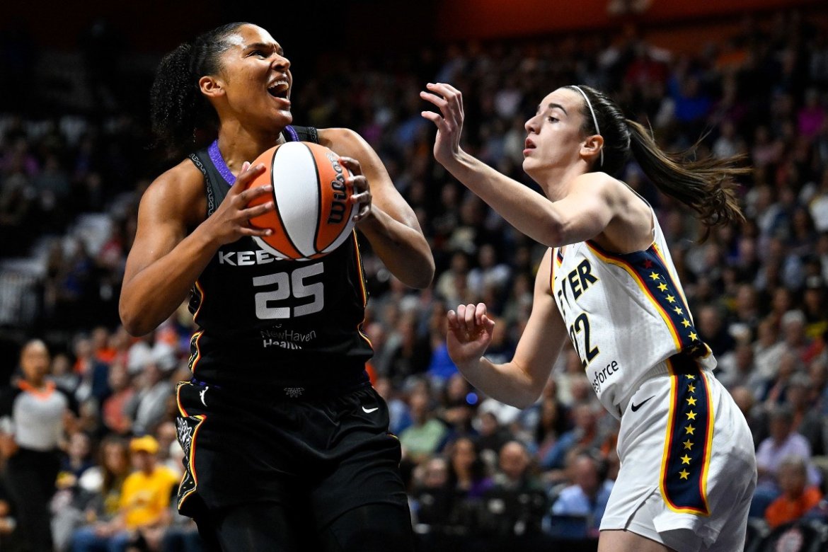 **This image is for use with this specific article only** Connecticut Sun forward Alyssa Thomas looks to shoot against Indiana Fever guard Caitlin Clark during Clark’s first WNBA game in Uncasville, Connecticut on Tuesday, May 14.