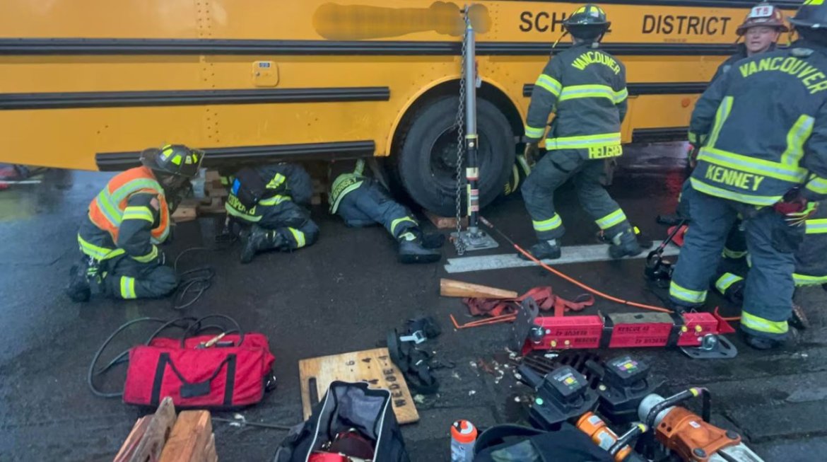 Embargo: Portland, OR; **This image is for use with this specific article only** Vancouver, Washington firefighters rescued a child on a bike pinned under a school bus.