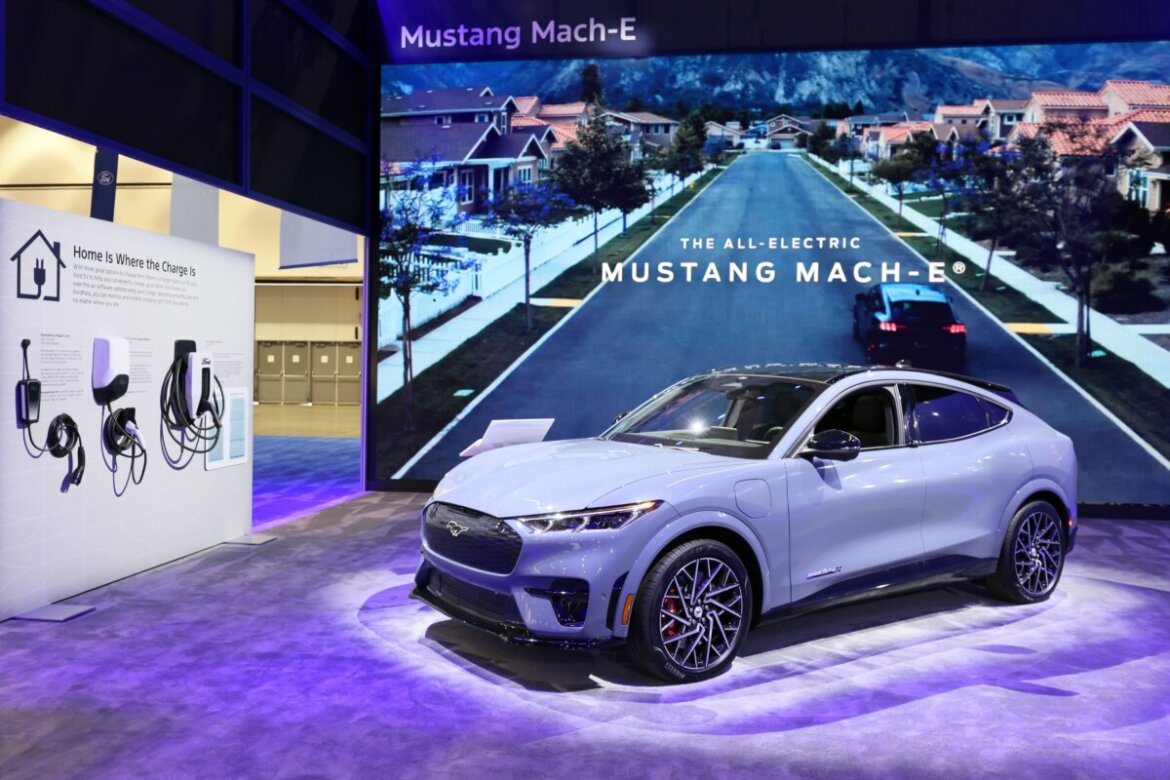 **This image is for use with this specific article only** The All-Electric Ford Mach-E is displayed during the 2023 Los Angeles Auto Show at the Los Angeles Convention Center on November 24, 2023 in Los Angeles.