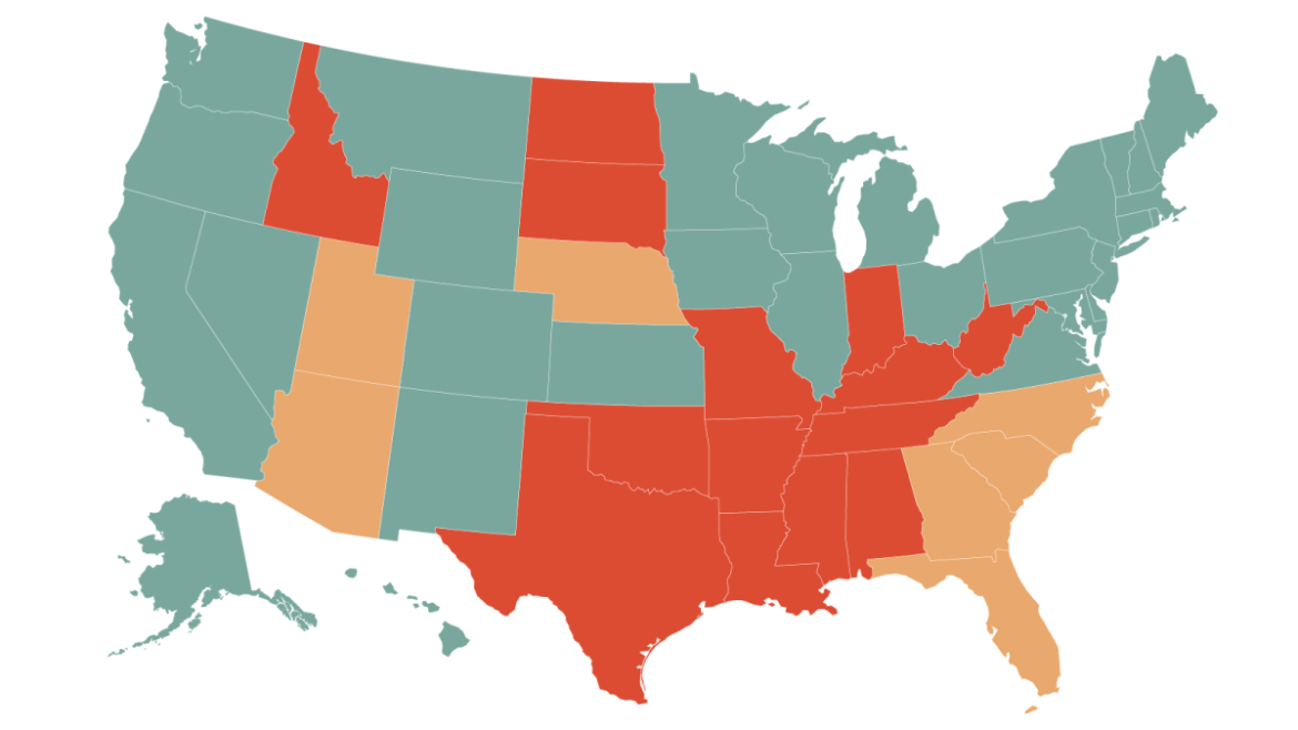 Embargo: NONE Here’s where abortion access currently stands in the United States (Red=banned; Brown=Legal with gestational limit of 6-18 weeks; Green=legal)